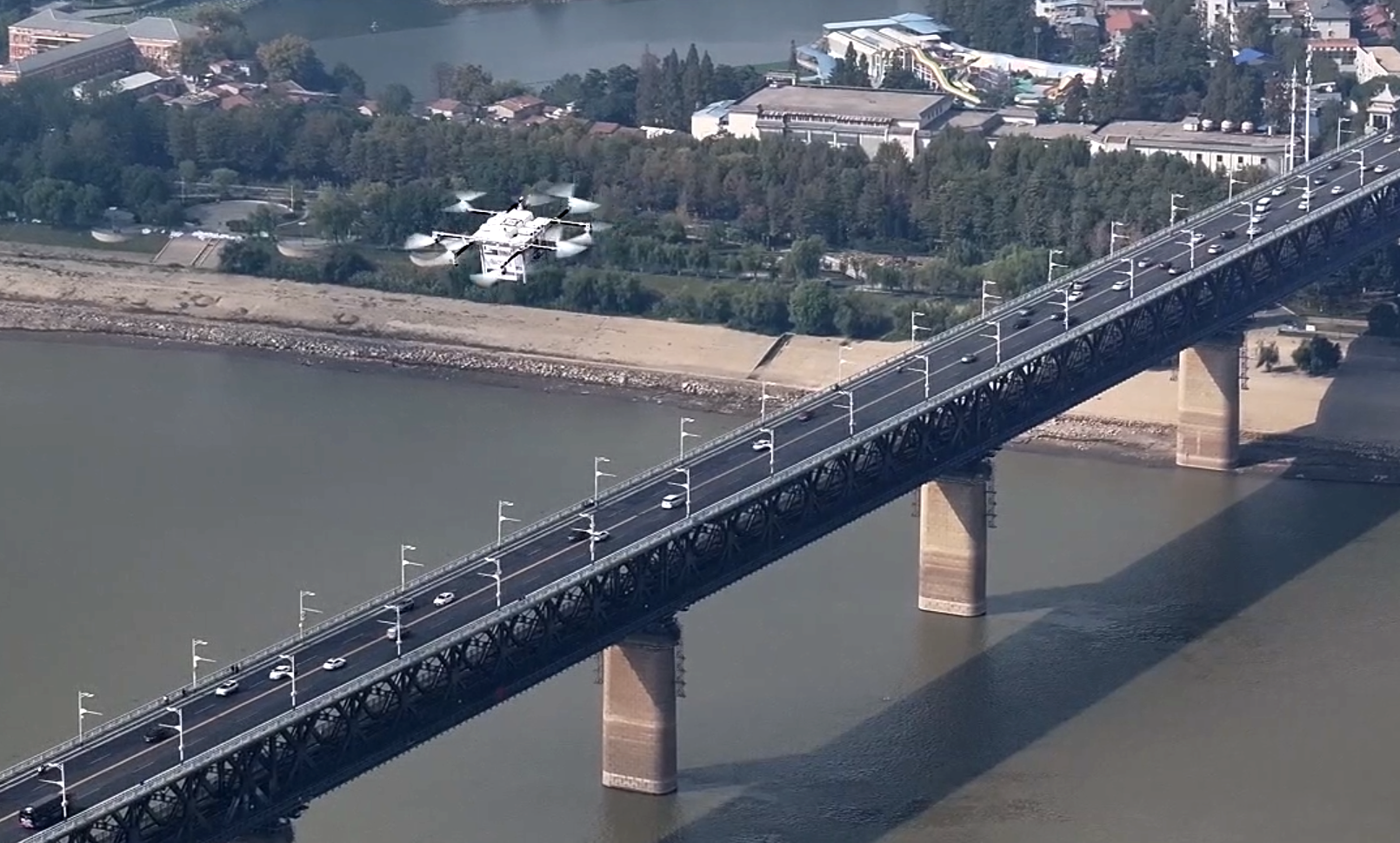 無人機越過長江。(湖北日報全媒記者 柯皓 通訊員 王箏 攝)