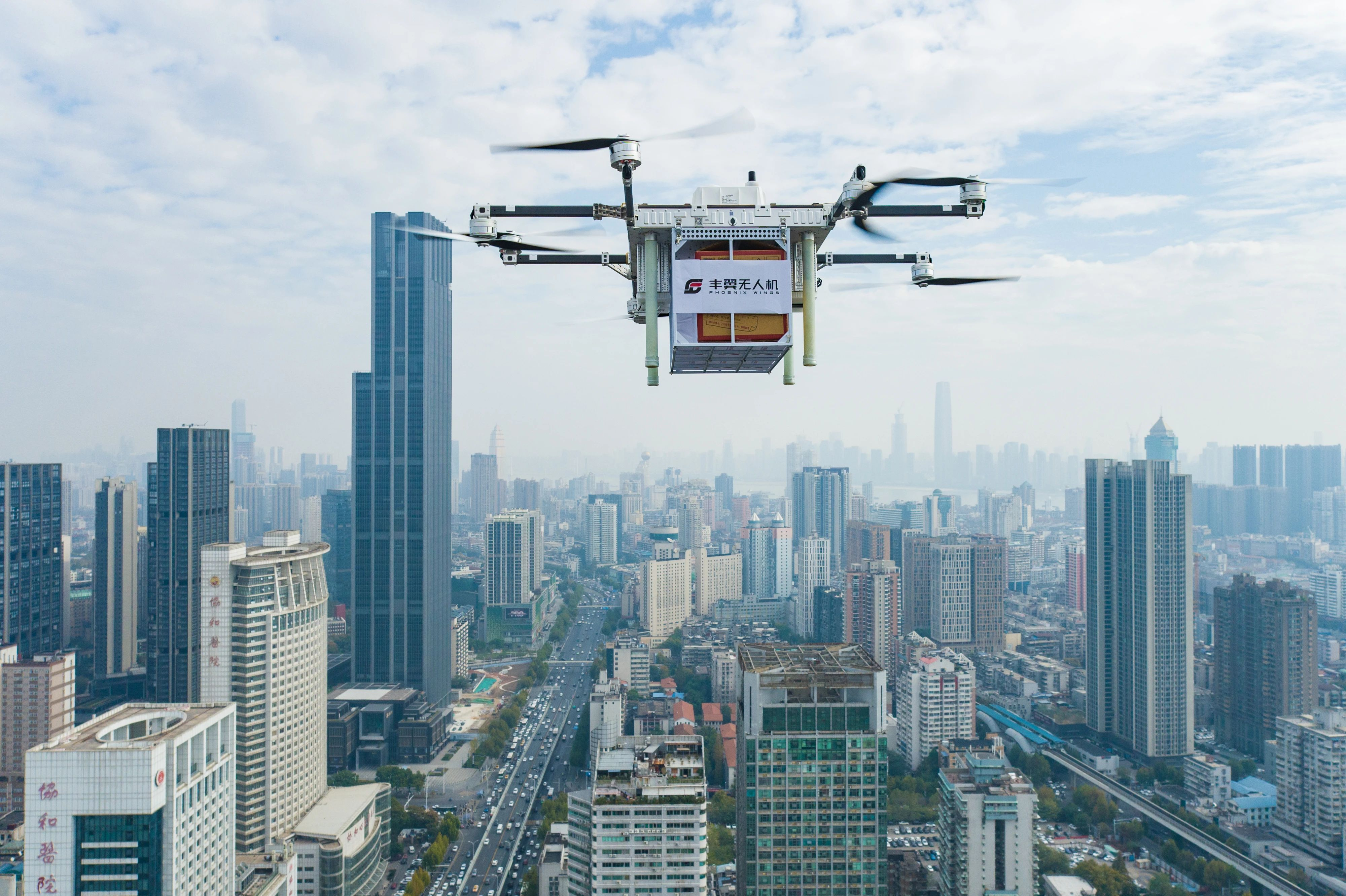 11月13日11時整,一臺方舟40順豐豐翼無人機攜帶著顧客下單的黃金、化妝品從華中第一商圈武商MALL起飛,相繼越過漢江、長江后,在全球最大純商業(yè)體武商夢時代樓頂降落,標志著全國首條跨江商貿低空無人機航線正式首飛。