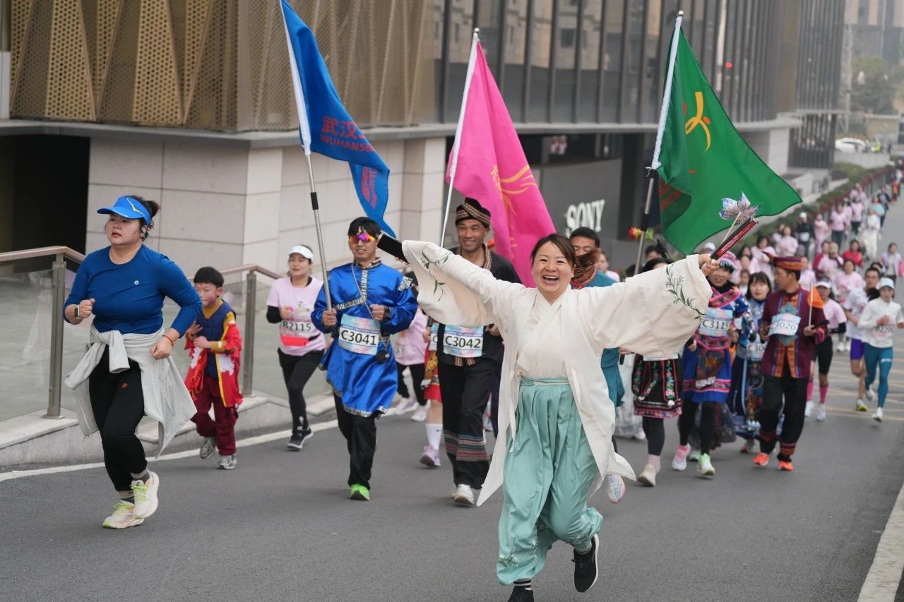 身著粉色參賽服的“櫻花女神”們洋溢著笑容,變裝跑參賽者們的造型更添亮色,“哪吒軍團(tuán)”活力十足,漢服少女衣袂翩躚宛如穿越時(shí)空,少數(shù)民族服飾銀飾叮咚作響,還有身著“哈利·波特”格蘭芬多院袍的母女揮動(dòng)魔杖魔法開(kāi)跑。